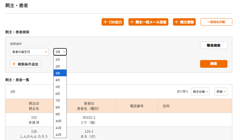 飼主・患者検索時に誕生月で絞り込める機能を追加いたしました。