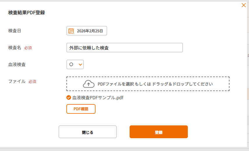 ②右上の「+検査結果PDF登録」ボタンをクリックします。