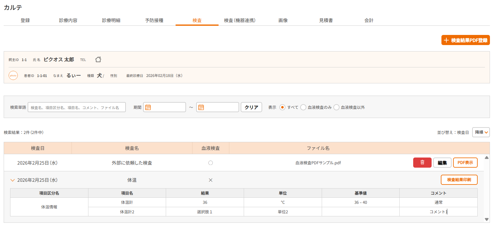⑥検査結果が登録され、検査画面に追加されます。